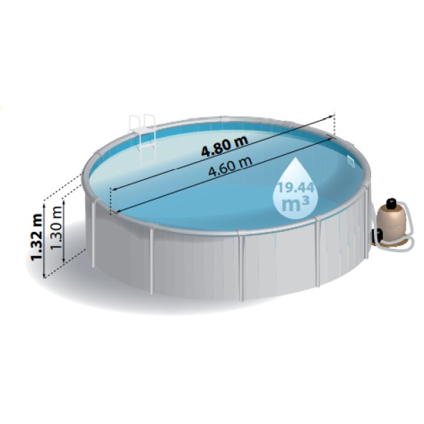 Piscine conçue entièrement en acier : structure et margelles.Son installation facile ne nécessite pas de dalle en béton obligatoire.